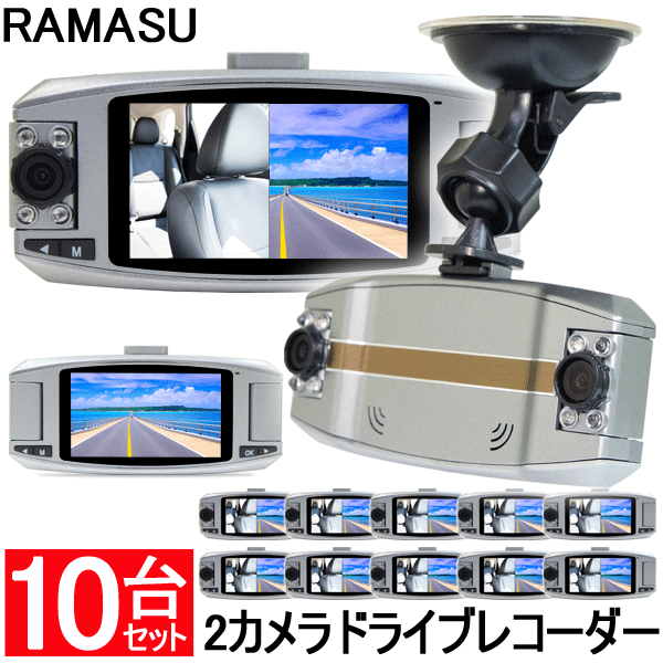 【あす楽対応 送料無料】ドラレコ 10台セット RAMASU 2カメラ搭載ドライブレコーダー RA-DT500 前後録画 W録画 WDR パーキングモニター FullHD Gセンサー 工事不要 法人 会社 まとめ買い 共同購入 セット割引【】