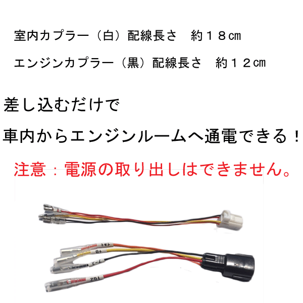 日本製の純正パーツを使用し日本の工場で製造! エンジンルームから室内に通線も簡単で安全!! 配線ごとに配線色も変えており、識別マーク付き!! カーDIY初心者で不安。
