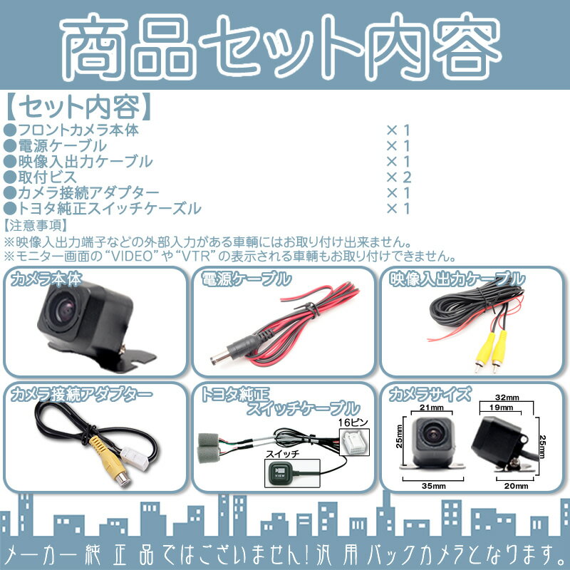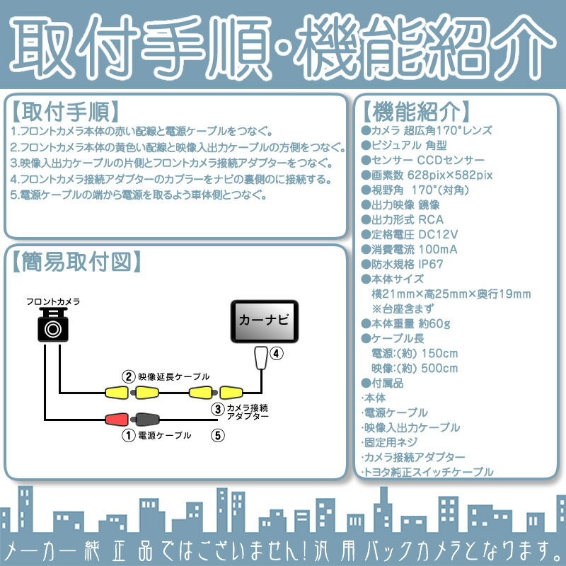 ◆商品仕様(フロントカメラ) 外観 角型 固定方法 ネジ固定 or 両面テープ固定(付属しません) センサー CCD 画素数 512pix×492pix 視野角 水平 120° / 垂直 90 °/ 対角 150° 出力映像 正像 ガイドライン 無し 映像出力端子 RCA 定格電圧 DC12V 消費電流 70mA 本体サイズ(最大) 横 35mm × 高 25mm × 奥行 32mm 電源ケーブルの長さ 約200cm 映像ケーブル長さ 約500cm ◆商品仕様(サイドカメラ) 外観 丸型 固定方法 埋込固定 センサー CCD 視野角 広角170° 出力映像 正像 ガイドライン 無し 映像出力端子 RCA 定格電圧 DC12V 本体サイズ 約φ22mm × 約20mm 電源ケーブルの長さ 約150cm 映像ケーブル長さ 約500cm ◆付属品(フロントカメラ) ・フロントカメラ本体 × 1 ・電源ケーブル × 1 ・映像ケーブル × 1 ・トヨタ/ダイハツ純正スイッチケーブル × 1(サイドカメラと共用) ・映像出力変換アダプター × 1 ◆付属品(サイドカメラ) ・サイドカメラ本体 × 1 ・電源ケーブル × 1 ・映像ケーブル × 1 ・ホールソー × 1 ・角度調整用レンチ × 1 ・映像出力変換アダプター × 1 ◆注意事項 ※必ずサイズ・形状・適合等をご確認の上、ご購入ください。
